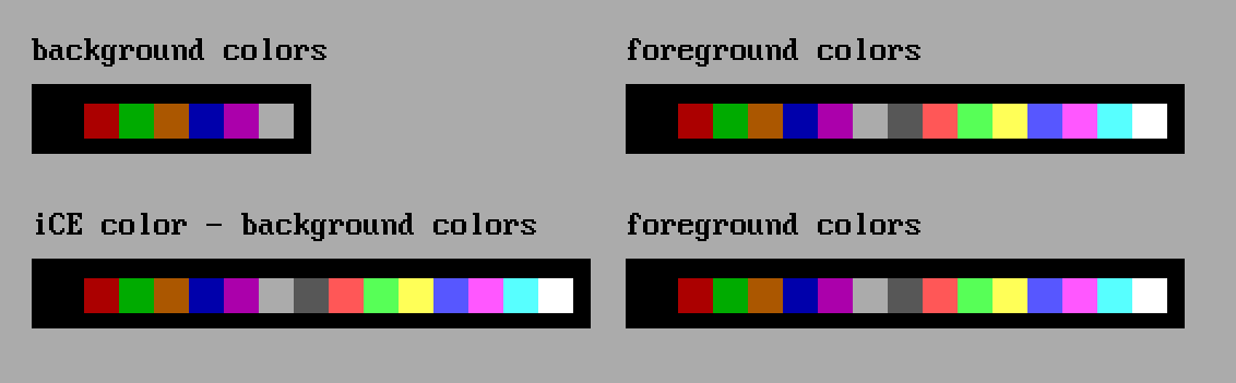 The ANSI specification has 16 foreground colors and 8 background colors. As shown below only the darker colors can be used as background colors. The specification also allowed for blinking characters and this bit was used to replace the blinking feature with the extra background colors. Using iCE colors in a viewer, client, editor, ... that doesn't support it would therefor result in blinking characters.