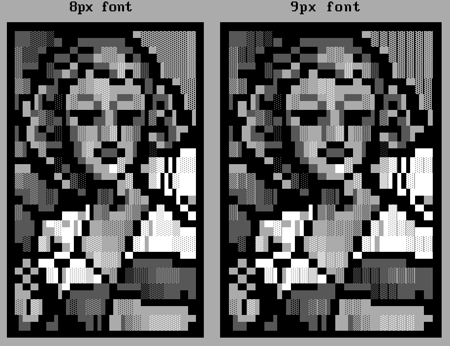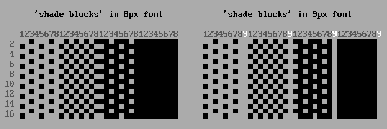 When these 'shade blocks' are used within ANSI art the difference between 8px (no shade block spacing) or 9px (with shade block spacing) there is a difference on in display and width: