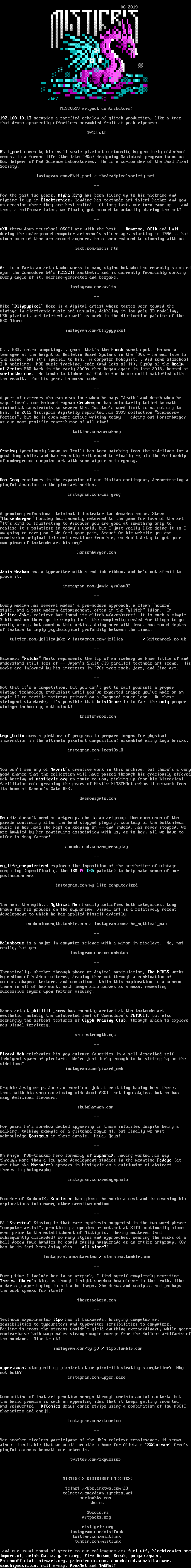 released in: blocktronics, sauna, mistigris, odium, toon, layerone, fire, amish, lazarus, impure, flashback