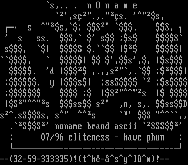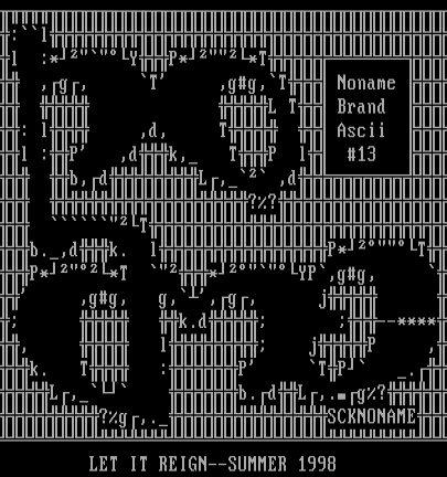 Noname was an ascii artgroup founded by Cain, Savage Dragon, and Polymorph in 1996. Noname merged with Mimic in 1998.