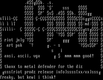 extensions: ANS (232), DIZ (1), ASC (51), NFO (16), EXE (5), GIF (67), ZIP (2), RIP (13), JPG (125), PCX (7), TXT (1)