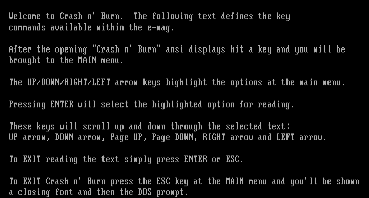 After the opening Crash n Burn ansi displays hit a key and you will be
