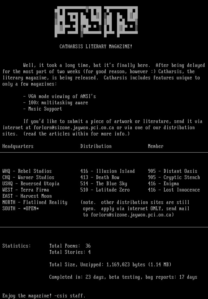 internet at forlorn@sizone.jaywon.pci.on.ca or via one of our distribution