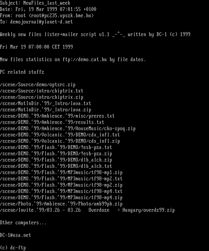 Weekly new files lister+mailer script v1.1 -- written by DC-1 c 1999