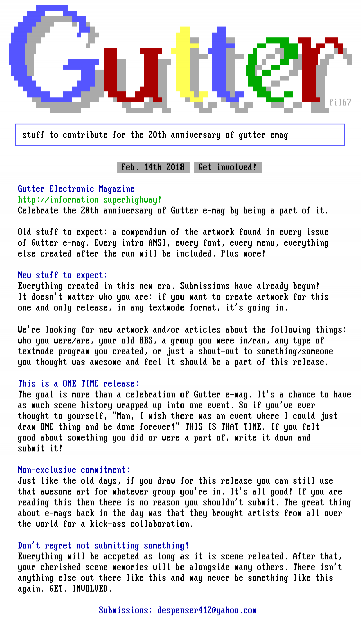 054730m of Gutter e-mag. Every intro ANSI, every font, every menu, everything