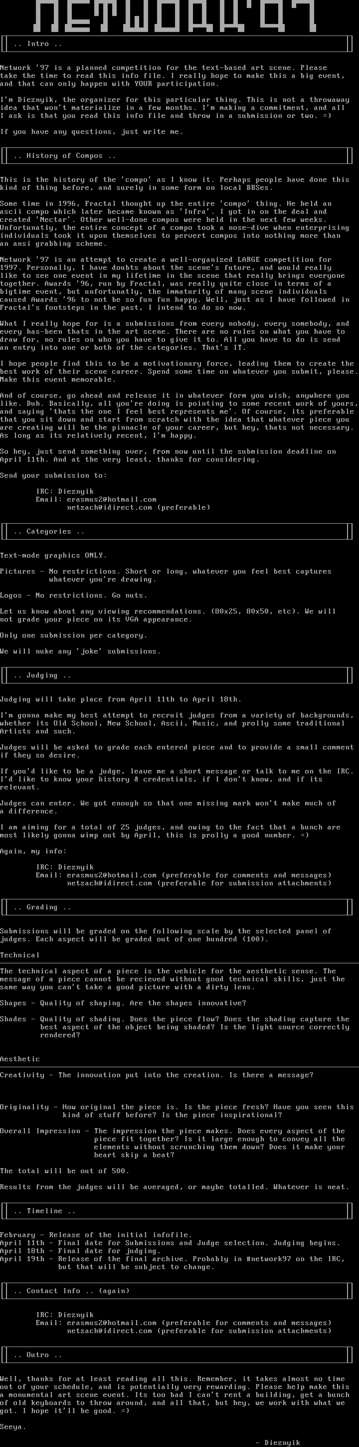April 19th - Release of the final archive. Probably in network97 on the IRC,