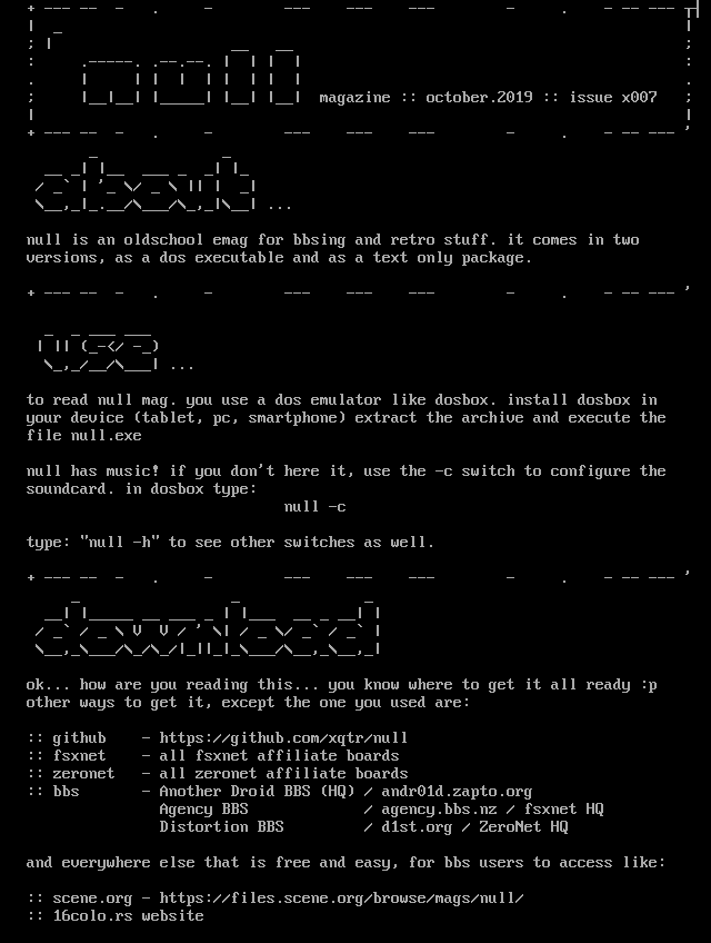 null is an oldschool emag for bbsing and retro stuff. it comes in two
