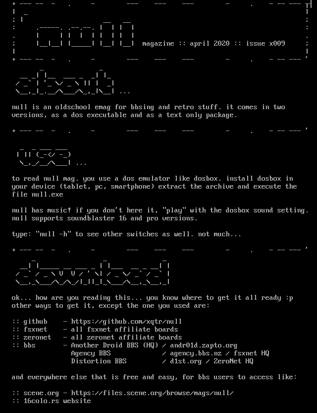 null is an oldschool emag for bbsing and retro stuff. it comes in two