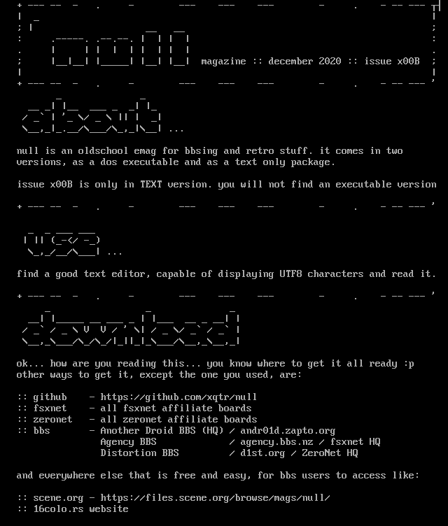 null is an oldschool emag for bbsing and retro stuff. it comes in two