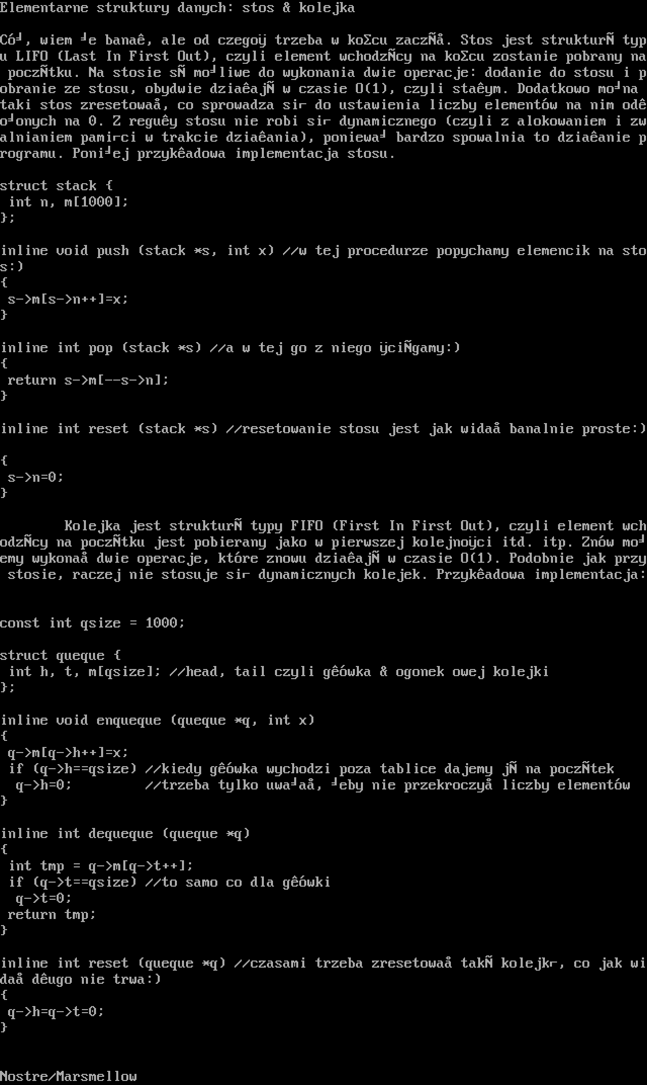 C, wiem e bana, ale od czego trzeba w kocu zacz. Stos jest struktur typu LIFO Last In First Out, czyli element wchodzcy na kocu zostanie pobrany na pocztku. Na stosie s moliwe do wykonania dwie operacje: dodanie do stosu i pobranie ze stosu, obydwie dziaaj w czasie O1, czyli staym. Dodatkowo mona taki stos zresetowa, co sprowadza si do ustawienia liczby elementw na nim odoonych na 0. Z reguy stosu nie robi si dynamicznego czyli z alokowaniem i zwalnianiem pamici w trakcie dziaania, poniewa bardzo spowalnia to dziaanie programu. Poniej przykadowa implementacja stosu.