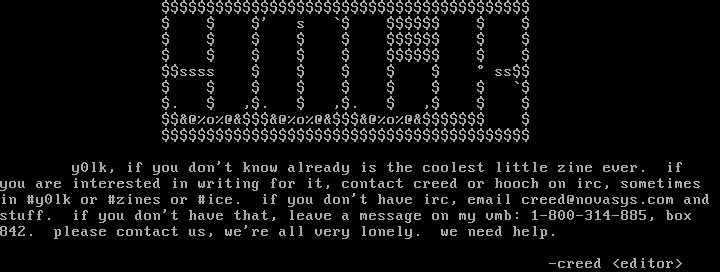 in y0lk or zines or ice. if you dont have irc, email creed@novasys.com and