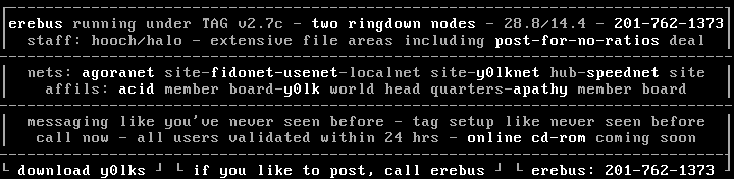 ------------------------------------------------------------------------------erebus running under TAG v2.7c - two ringdown nodes - 28.8/14.4 - 201-762-1373 staff: hooch/halo - extensive file areas including post-for-no-ratios deal -------------------------------------------------------------------------------- nets: agoranet site-fidonet-usenet-localnet site-y0lknet hub-speednet site affils: acid member board-y0lk world head quarters-apathy member board -------------------------------------------------------------------------------- messaging like youve never seen before - tag setup like never seen before call now - all users validated within 24 hrs - online cd-rom coming soon ------------------------------------------------------------------------------- download y0lks if you like to post, call erebus erebus: 201-762-1373