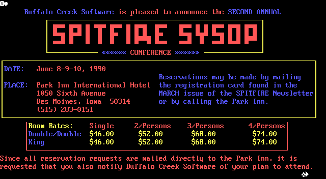 Since all reservation requests are mailed directly to the Park Inn, it isrequested that you also notify Buffalo Creek Software of your plan to attend.