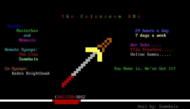 T h e C o l o s s e u m B B s Sysops: Masterhan 24 hours a day and 7 days a week