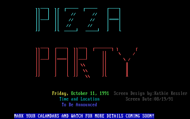 Friday, October 11, 1991 Screen Design by:Kathie Kessler Time and Location Screen Date:08/19/91 To Be Announced MARK YOUR CALANDARS AND WAT