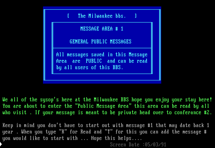 be read by all users of this BBS. We all of the sysops here at the Milwauke