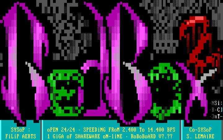 NSi: BC 3nT- SYSoP : oPEN 24/24 SPEEDiNG FRoM 2.400 To 14.400 BPS Co-SYSoP FiLiP AERTS 1 GiGA oF SHAREWARE oN-liNE RoBoBoARD V?.?? S. LEMAiRE