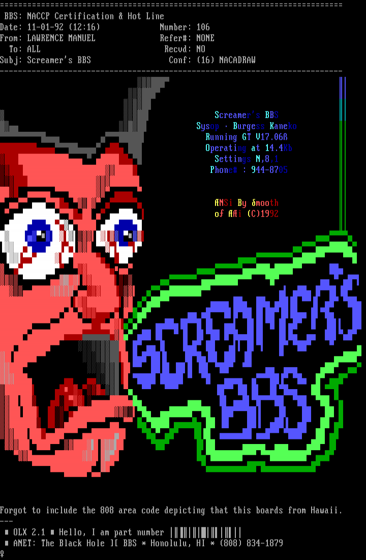 Subj: Screamers BBS Conf: 16 NACADRAW