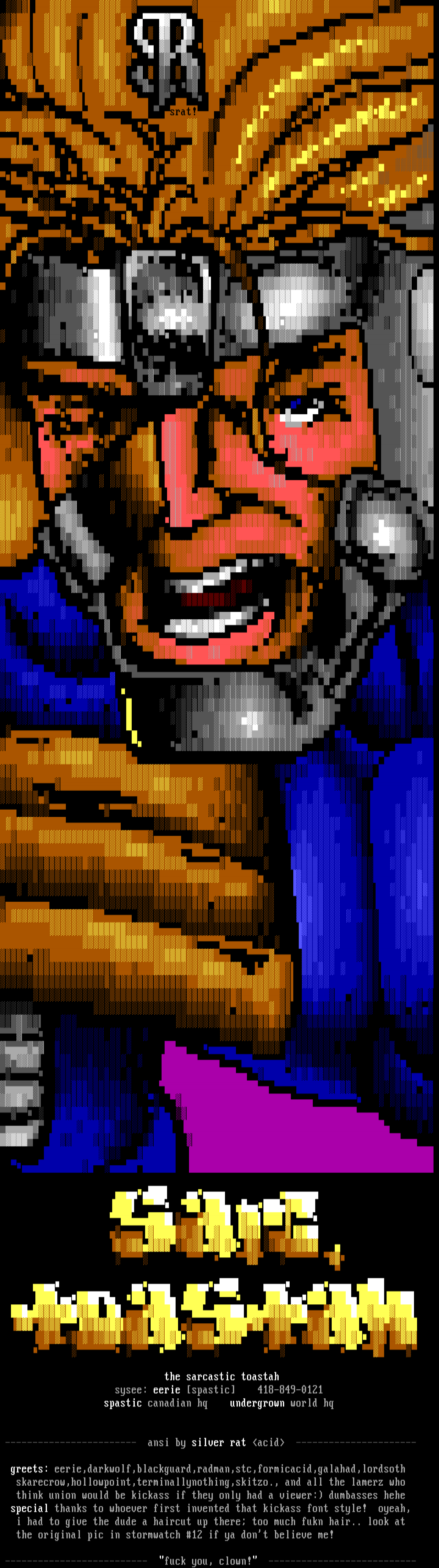 greets: eerie,darkwolf,blackguard,radman,stc,formicacid,galahad,lordsoth