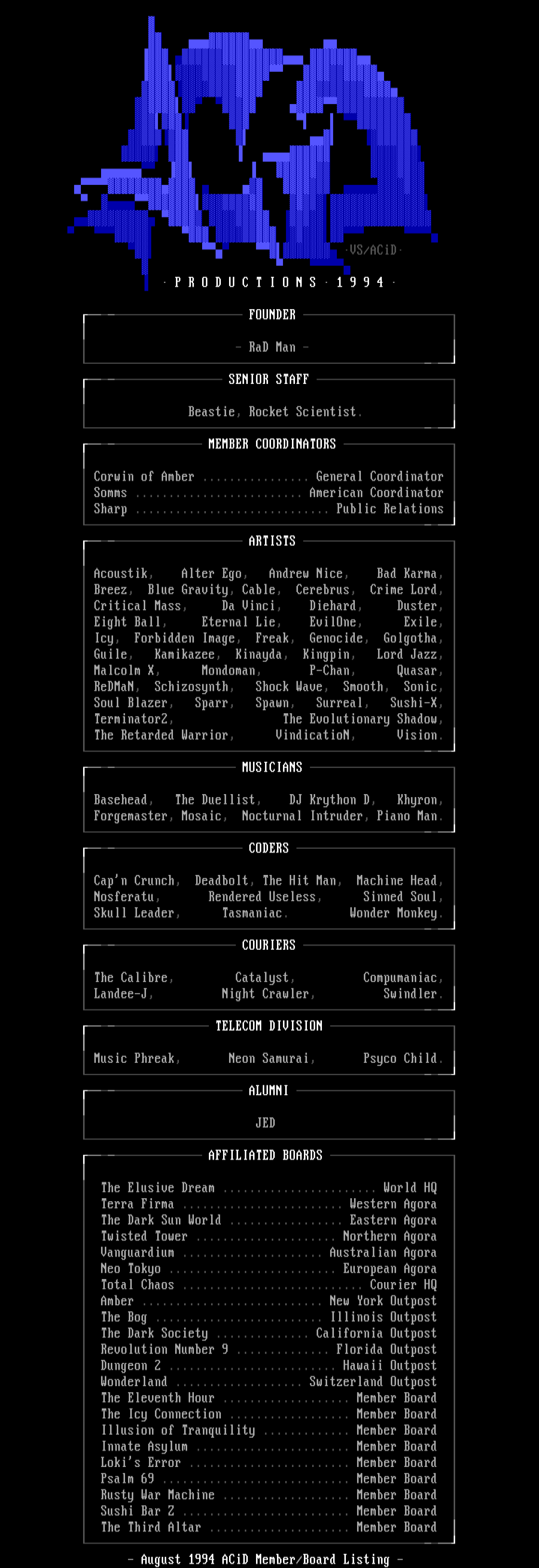 - August 1994 ACiD Member/Board Listing -