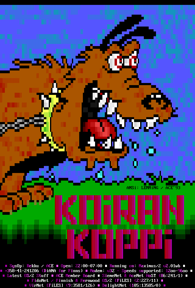 SysOp: Rekku / ACE Open: 22:00-07:00 Running on: Maximus/2 v2.01wb