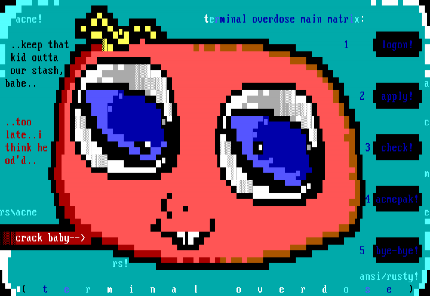 acme! terminal overdose main matrix: ..keep that 1 logon!