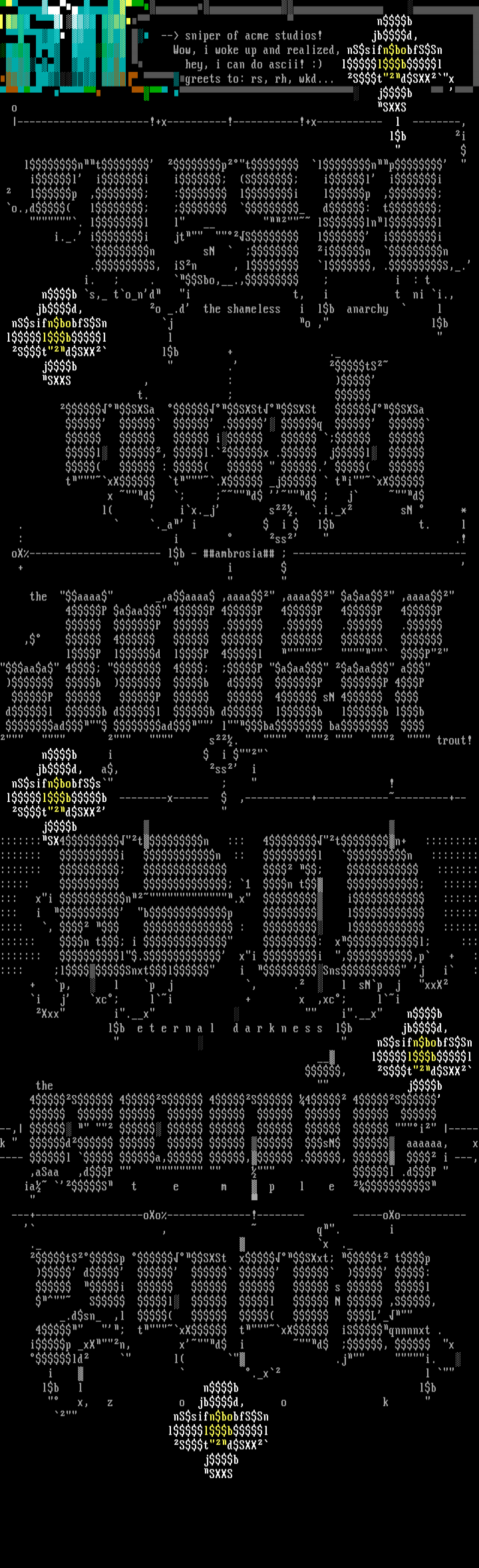 nb -- sniper of acme studios! jbd, Wow, i woke up and realized, nSsifnbobfSSn hey, i can do ascii! : llbl greets to: rs, rh, wkd... StdSXXx jb o SXXS