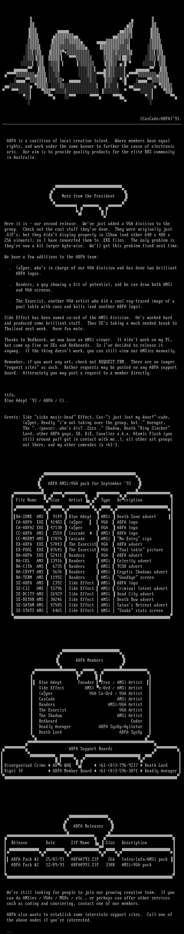 ADFA Pack 1 25/07/93 ADFA0793.ZIP 26k Intro/Info/ANSi pack