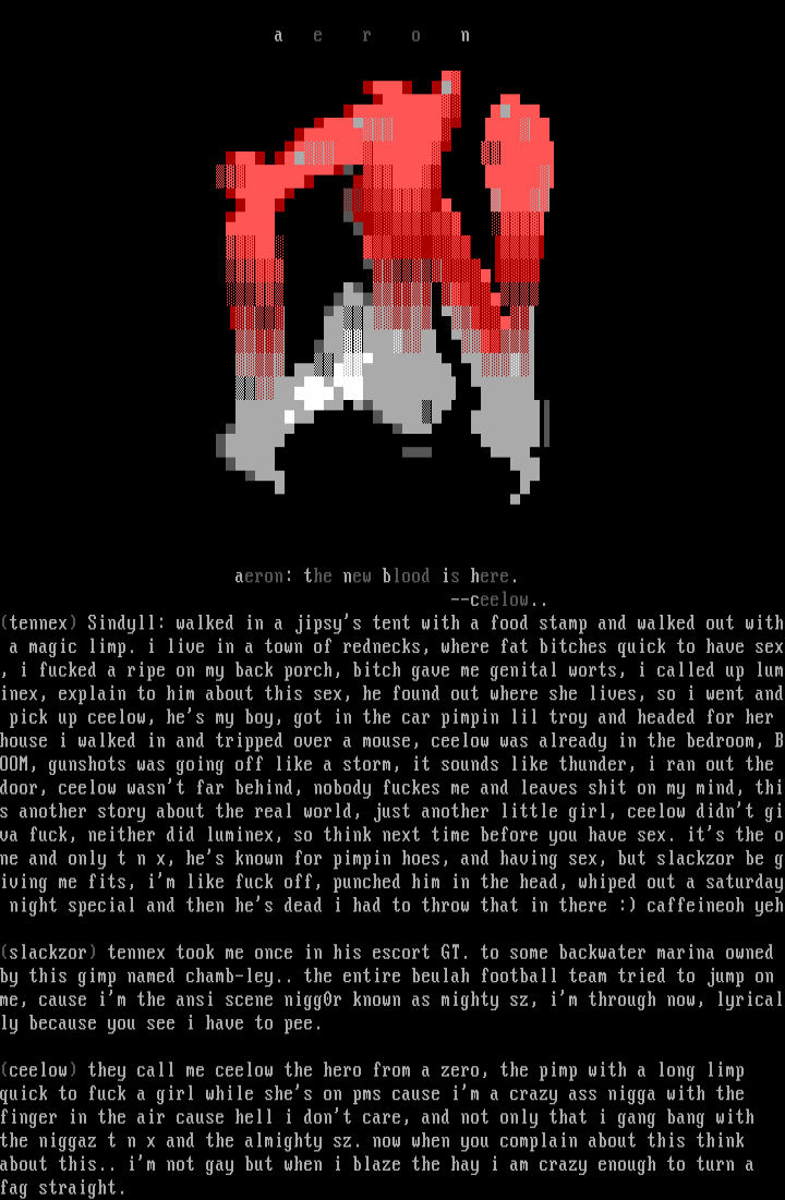 nce in his escort GT. to some backwater marina owned by this gimp named chamb-ley.. the entire beulah football team tried to jump on me, cause im the ansi scene nigg0r known as mighty sz, im through now, lyrically because you see i have