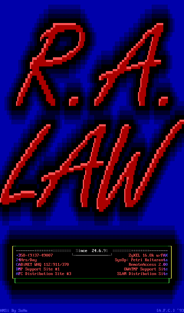 -------- Since 24.6.91 -------- +358-937-49007 ZyXEL 16.8k w/FAX 24Hrs/Day SysOp: Petri Kultaranta CABiNET WHQ 112:911/370 RemoteAccess 2.00 DMP Support Site 1 OWATMP Support Site AFC Distribution Site 3 SLAM Distribution Site ANSi By SuHu A.F.C. 9