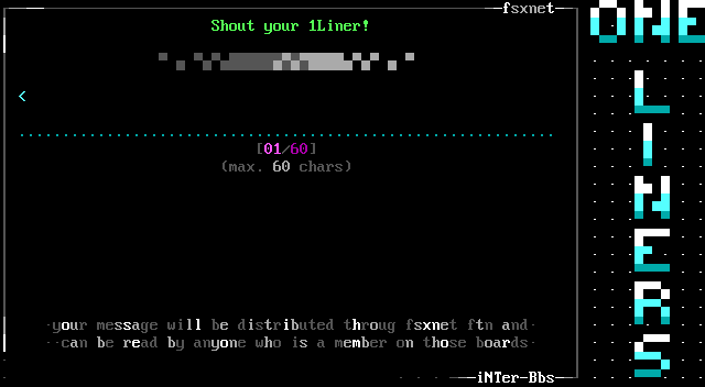 ............................................................. 01/60 max. 60 chars your message will be distributed throug fsxnet ftn and can be read by anyone who is a member on those boards iNTer-Bbs