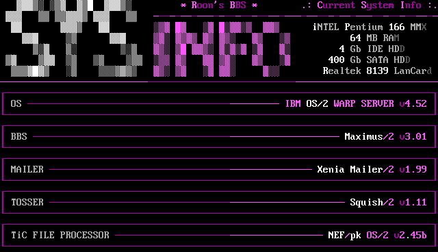OS IBM OS/2 WARP SERVER v4.52 BBS Maximus/2 v3.01 MAILER Xenia Mailer/2 v1.99 TOSSER Squish/2 v1.11 TiC FILE PROCESSOR NEF/pk OS/2 v2.45b