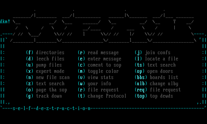 .----/ // / // // l // // / // // ----. l/ : f directories r read message j join confs :: d leech files e enter message l locate a file :: u pump files c coment to sop ts text search :: x expert mode m toggle color op open doors :: n new file scan v view stats bbs boards list :: z text search w your info ulb change ulby : o page tha sop r file request req file request g track down t change Protocol top top dewds ., ,.----s-e-l-f--d-e-z-t-r-u-c-t-i-o-n--------------------------------------------