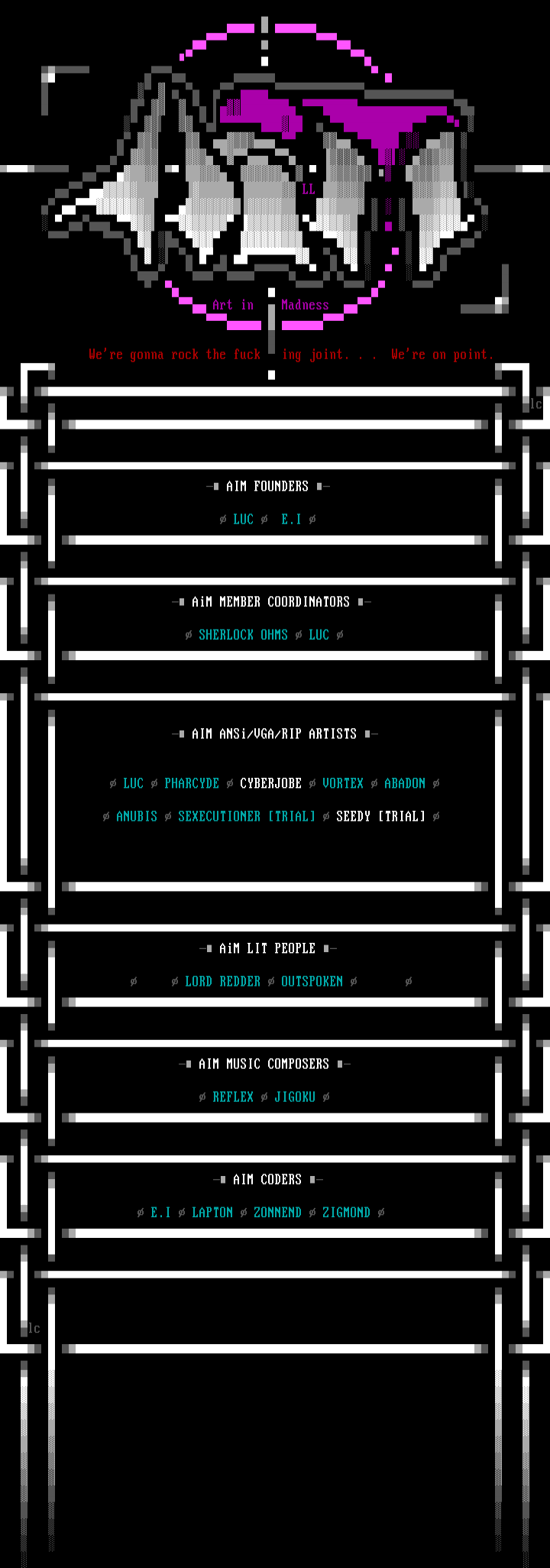 AIM ANSi/VGA/RIP ARTISTS LUC PHARCYDE CYBERJOBE VORTEX ABADON ANUBIS SEXECUTIONER TRIAL SEEDY TRIAL