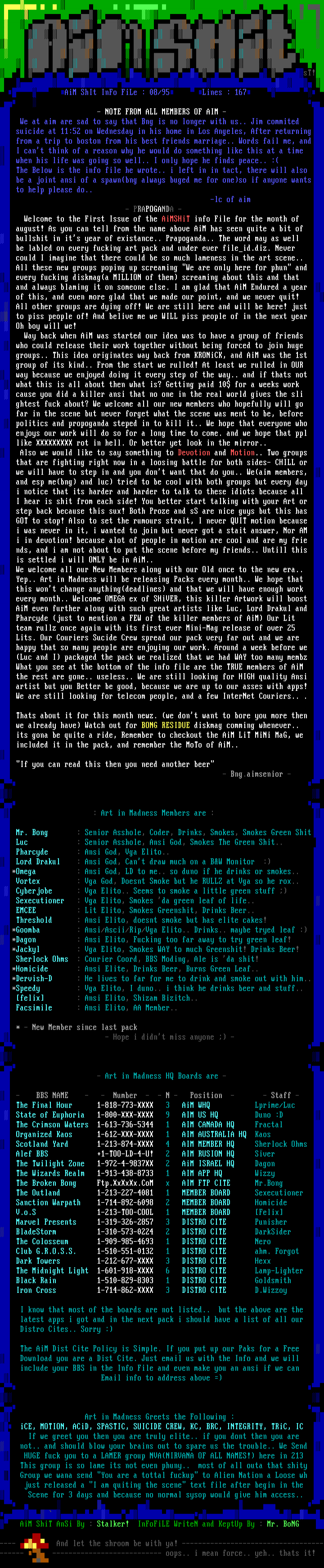 - NOTE FROM ALL MEMBERS OF AIM - We at aim are sad to say that Bng is no longer with us.. Jim commited suicide at 11:52 on Wednesday in his home in Los Angeles, After returning from a trip to boston from his best friends marriage.. Words fail me, and I cant think of a reason why he would do something like this at a time when his life was going so well.. I only hope he finds peace.. : The Below is the info file he wrote.. i left in in tact, there will also be a joint ansi of a spawnbng always buged me for oneso if anyone wants to help please do.. -lc of aim - PRAPOGANDA - Welcome to the First Issue of the AiMSHiT info File for the month of august! As you can tell from the name above AiM has seen quite a bit of bullshit in its year of existance.. Prapoganda.. The word may as well be labled on every fucking art pack and under ever fileid.diz. Never could I imagine that there could be so much lameness in the art scene.. All these new groups poping up screaming We are only here for phun and every fucking diskmaga MILLION of them screaming about this and that and always blaming it on someone else. I am glad that AiM Endured a year of this, and even more glad that we made our point, and we never quit! All other groups are dying off! We are still here and will be here! just to piss people of! And belive me we WILL piss people of in the next year Oh boy will we! Way back when AiM was started our idea was to have a group of friends who could release their work together without being forced to join huge groups.. This idea originates way back from KRONiCK, and AiM was the 1st group of its kind.. From the start we rulled! At least we rulled in OUR way because we enjoyed doing it every step of the way.. and if thats not what this is all about then what is? Getting paid 10 for a weeks work cause you did a killer ansi that no one in the real world gives the sli ghtest fuck about? We welcome all our new members who hopefully will go far in the scene but never forget what the scene was ment to be, before politics and propoganda steped in to kill it.. We hope that everyone who enjoys our work will do so for a long time to come. and we hope that ppl like XXXXXXXXX rot in hell. Or better yet look in the mirror.. Also we would like to say something to Devotion and Motion.. Two groups that are fighting right now in a loosing battle for both sides- CHILL or we will have to step in and you dont want that do you.. Weaim members, and esp mebng and luc tried to be cool with both groups but every day i notice that its harder and harder to talk to these idiots because all I hear is shit from each side! You better start talking with your Art or step back because this sux! Both Proze and sS are nice guys but this has GOT to stop! Also to set the rumours strait, I never QUIT motion because i was never in it, i wanted to join but never got a stait answer, Nor AM i in devotion! because alot of people in motion are cool and are my frie nds, and i am not about to put the scene before my friends.. Untill this is settled i will ONLY be in AiM.. We welcome all our New Members along with our Old once to the new era.. Yep.. Art in Madness will be releasing Packs every month.. We hope that this wont change anythingdeadlines and that we will have enough work every month.. Welcome OMEGA ex of SHiVER, this killer Artwork will boost AiM even further along with such great artists like Luc, Lord Drakul and Pharcyde just to mention a FEW of the killer members of AiM Our Lit team rullz once again with its first ever Mini-Mag release of over 25 Lits. Our Couriers Sucide Crew spread our pack very far out and we are happy that so many people are enjoying our work. Around a week before we Luc and I packaged the pack we realized that we had WAY too many membz What you see at the bottom of the info file are the TRUE members of AiM the rest are gone.. useless.. We are still looking for HIGH quality Ansi artist but you Better be good, because we are up to our asses with apps! We are still looking for telecom people, and a few InterNet Couriers.. . Thats about it for this month newz. we dont want to bore you more then we already have Watch out for BONG RESIDUE diskmag comming whenever.. its gona be quite a ride, Remember to checkout the AiM LiT MiNi MaG, we included it in the pack, and remember the MoTo of AiM.. If you can read this then you need another beer - Bng.aimsenior -
