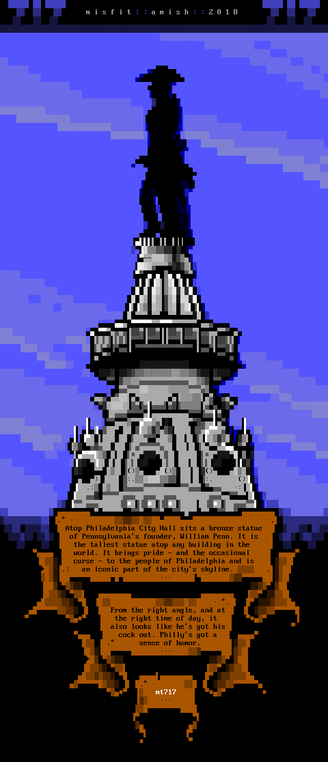 -- :. :. .: : . . Atop Philadelphia City Hall sits a bronze statue of Pennsylvanias founder, William Penn. It is