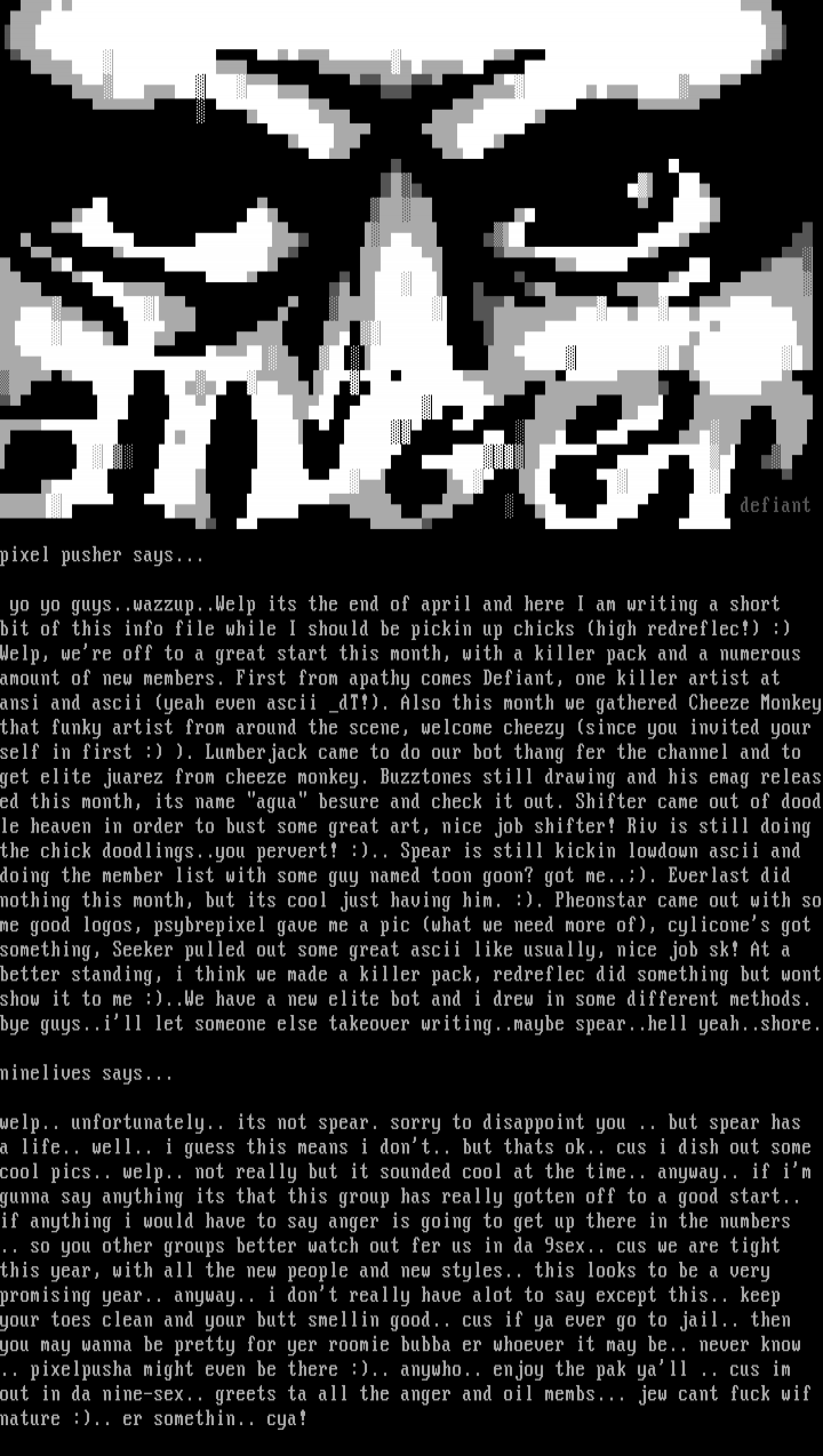 ansi and ascii yeah even ascii dT!. Also this month we gathered Cheeze Monkeythat funky artist from around the scene, welcome cheezy since you invited your self in first : . Lumberjack came to do our bot thang fer the channel and to