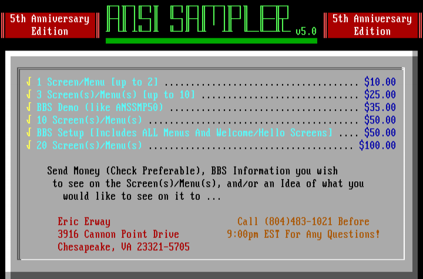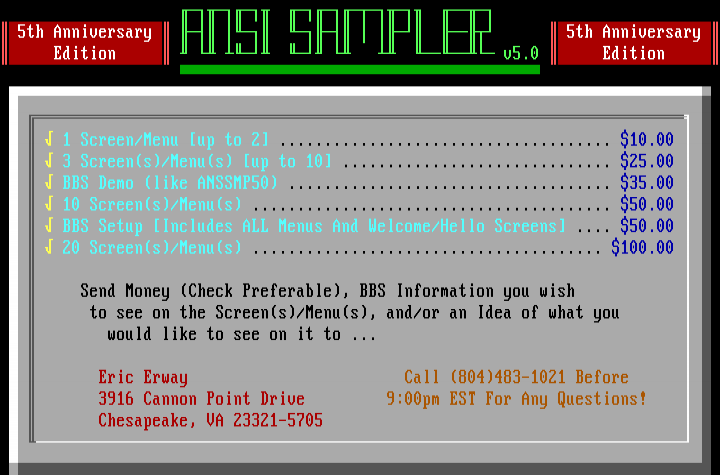 BBS Demo like ANSSMP50 ....................................35.00 10 Screens/Menus ...........................
