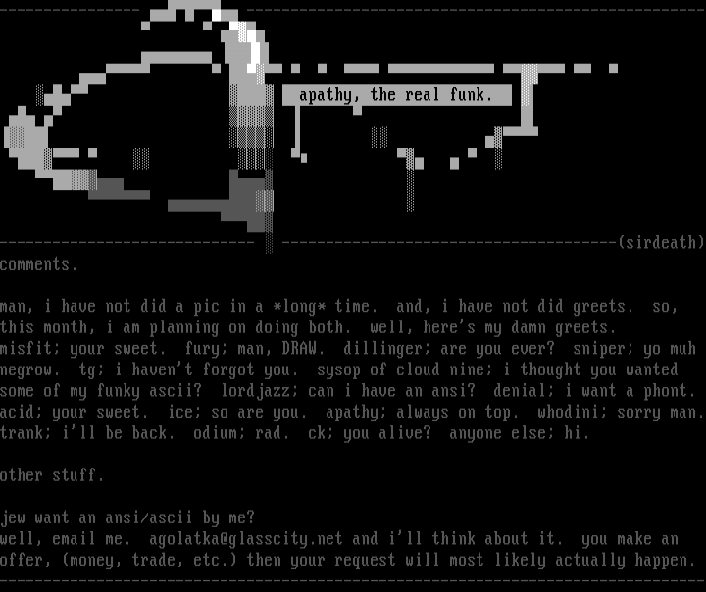 some of my funky ascii? lordjazz can i have an ansi? denial i want a phont. acid your sweet. ice so are you. apathy always on top. whodini sorry man.trank ill be back. odium rad. ck you alive? anyone else hi.