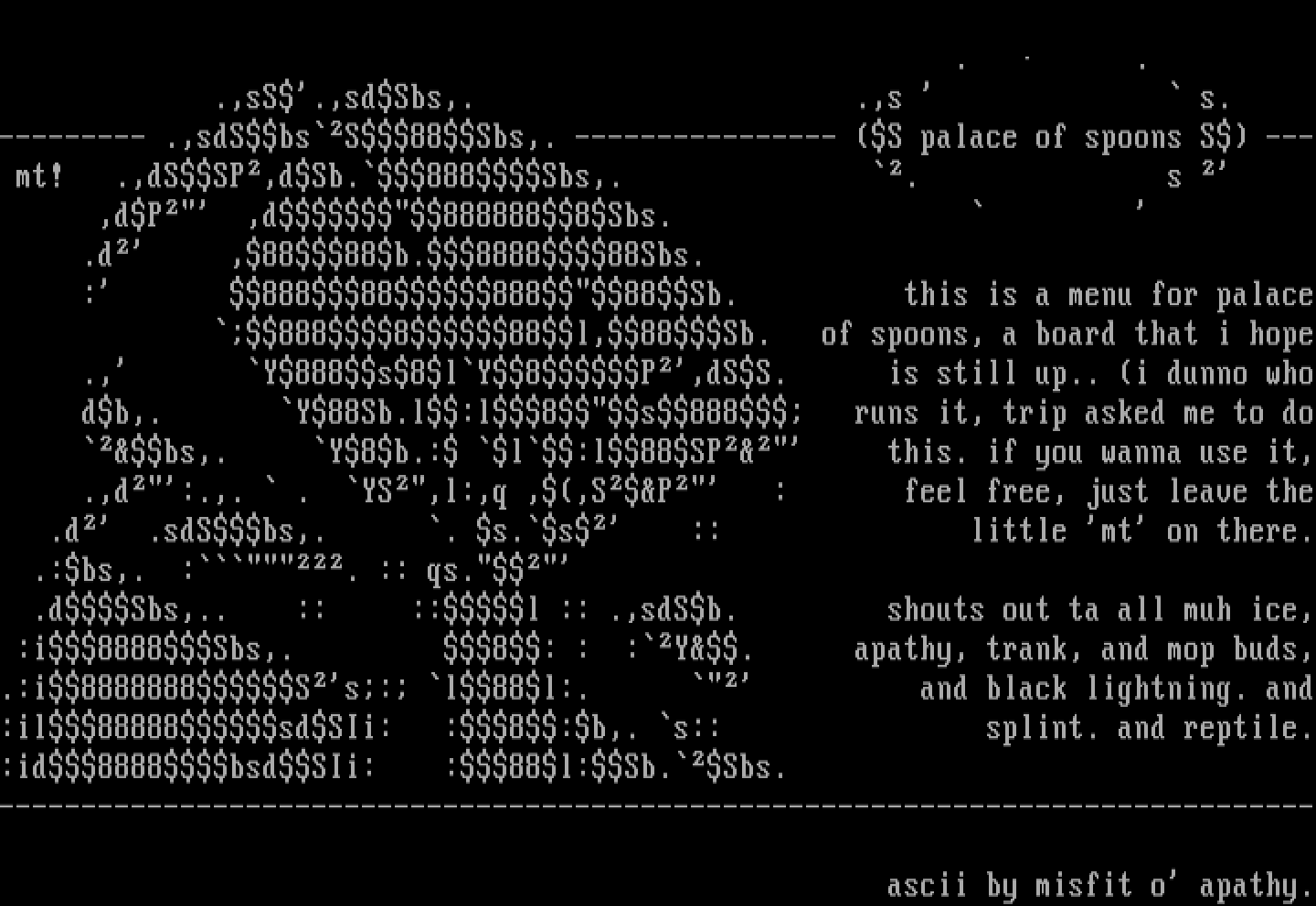 : 8888888888Sb. this is a menu for palace 888888l,88Sb. of spoons, a board that i hope ., Y888s8lY8P,dSS. is still up.. i dunno who db,. Y88Sb.l:l8s888 runs it, trip asked me to do bs,. Y8b.: l:l88SP this. if you wanna use it, .,d:.,. . YS,l:,q ,,SP : feel free, just leave the .d .sdSbs,. . s.s :: little mt on there. .:bs,. :. :: qs.