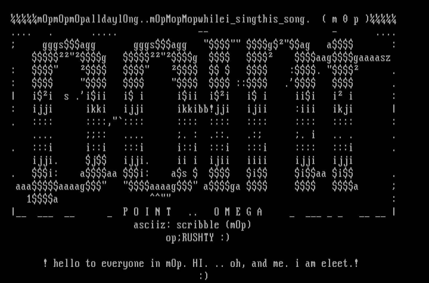 ! hello to everyone in mOp. HI. .. oh, and me. i am eleet.!