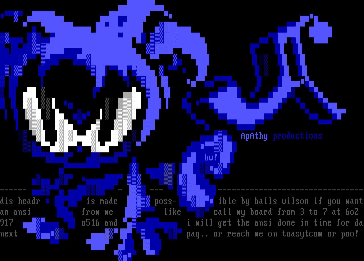 ------ - --- --------------------------------dis headr is made poss- ible by balls wilson if you wantan ansi from me like call my board from 3 to 7 at 6o2 917 o516 and i will get the ansi done in time for danext paq.. or reach me on toasytcom or poo!