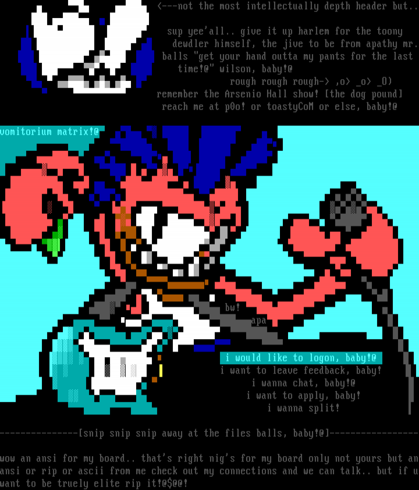 wow an ansi for my board.. thats right nigs for my board only not yours but anansi or rip or ascii from me check out my connections and we can talk.. but if uwant to be truely elite rip it!@@@!