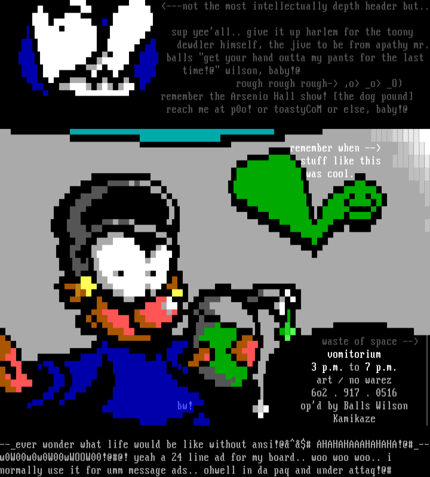 waste of space -- vomitorium 3 p.m. to 7 p.m. art / no warez 6o2 . 917 . 0516 bw! opd by Balls Wilson Kamikaze