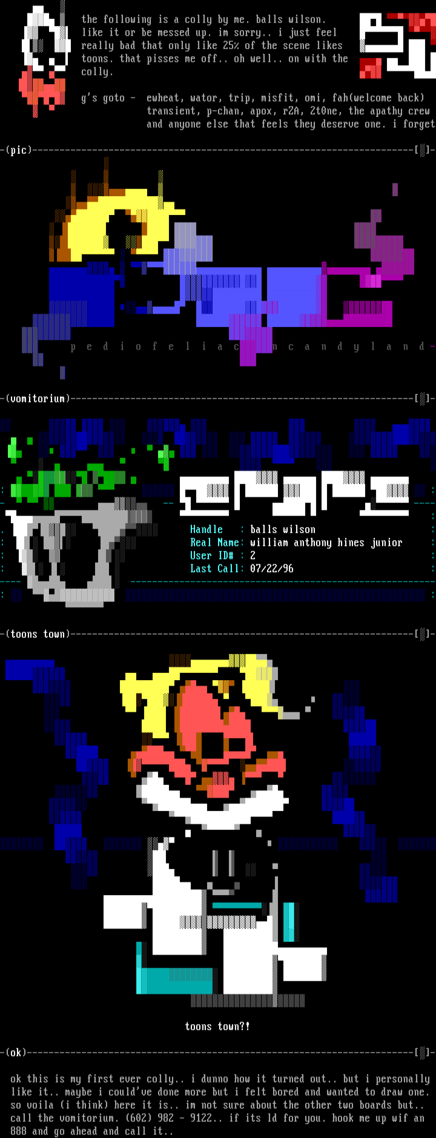 : :- -- ---- :. Handle : balls wilson :: Real Name: william anthony hines junior :: User ID : 2 :: Last Call: 07/22/96 :---- --------------------------------------------------------: :