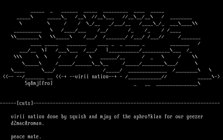 virii nation done by squish and mjay of the aphro!klan for our geezer