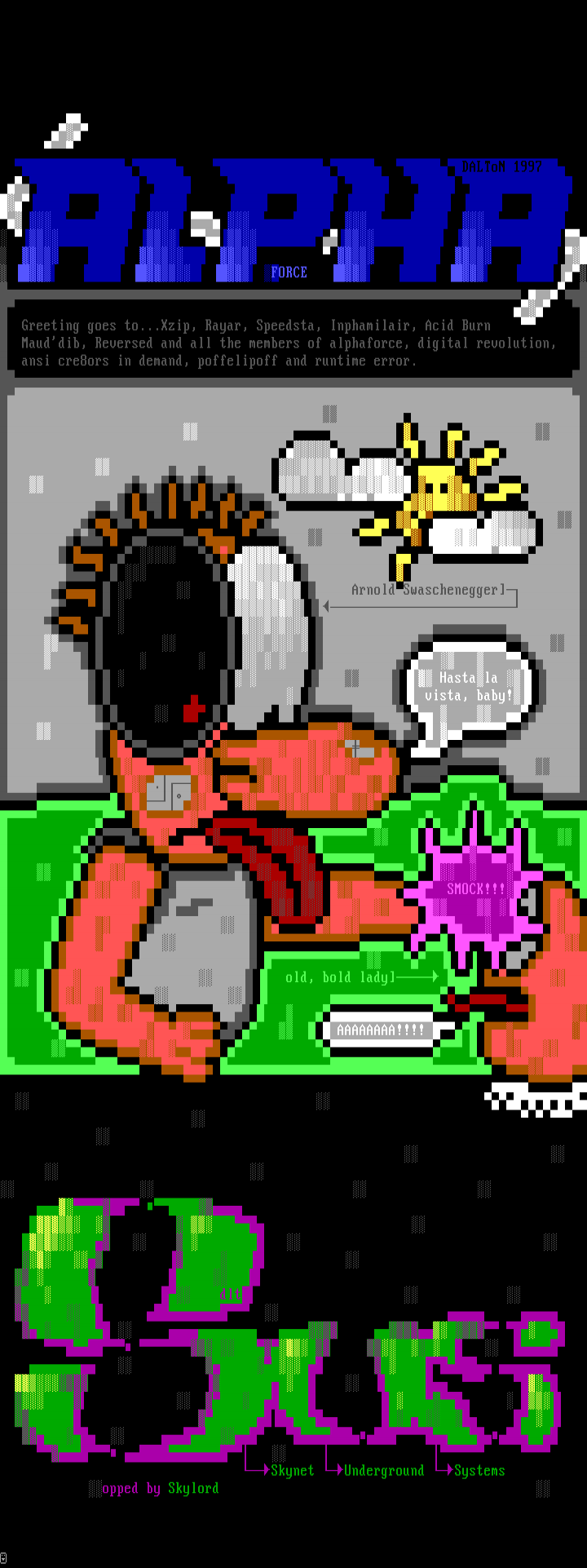 Greeting goes to...Xzip, Rayar, Speedsta, Inphamilair, Acid Burn Mauddib, Reversed and all the members of alphaforce, digital revolution,