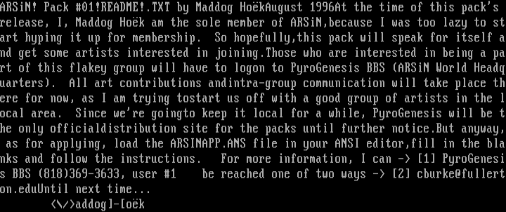 ARSiN! Pack 01 !README!.TXT by Maddog Hok August 1996 At the time of this packs release, I, Maddog Hok am the sole member of ARSiN, because I was too lazy to start hyping it up for membership. So hopefully, this pack will speak for itself and get some artists interested in joining. Those who are interested in being a part of this flakey group will have to log on to PyroGenesis BBS ARSiN World Headquarters. All art contributions and intra-group communication will take place there for now, as I am trying to start us off with a good group of artists in the local area. Since were going to keep it local for a while, PyroGenesis will be the only official distribution site for the packs until further notice. But anyway, as for applying, load the ARSINAPP.ANS file in your ANSI editor, fill in the blanks and follow the instructions. For more information, I can - 1 PyroGenesis BBS 818369-3633, user 1 be reached one of two ways - 2 cburke@fullerton.edu Until next time... /addog-ok
