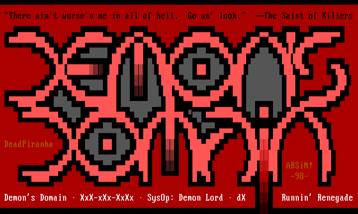 There aint worsen me in all of hell. Go an look. The Saint of Killers DeadPiranha ARSiN! -98- Demons Domain XxX-xXx-XxXx SysOp: Demon Lord dX Runnin Renegade
