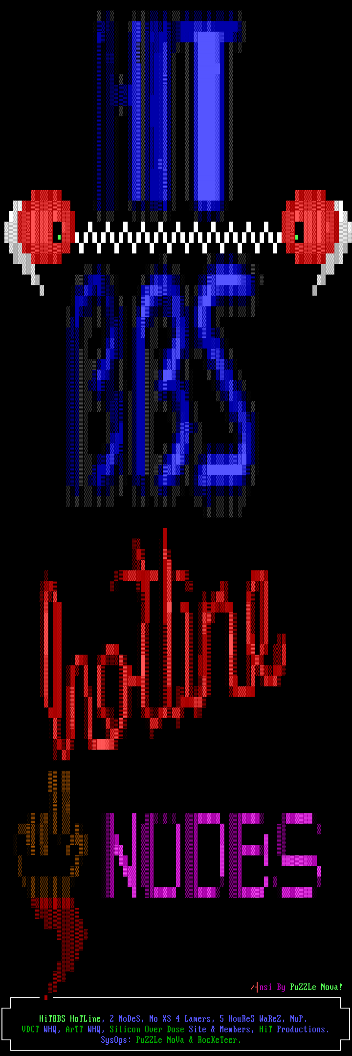 HiTBBS HoTLine, 2 NoDeS, No XS 4 Lamers, 5 HouReS WaReZ, NuP. VDCT WHQ, ArTT WHQ, Silicon Over Dose Site Members, HiT Productions. SysOps: PuZZLe NoVa RocKeTeer.